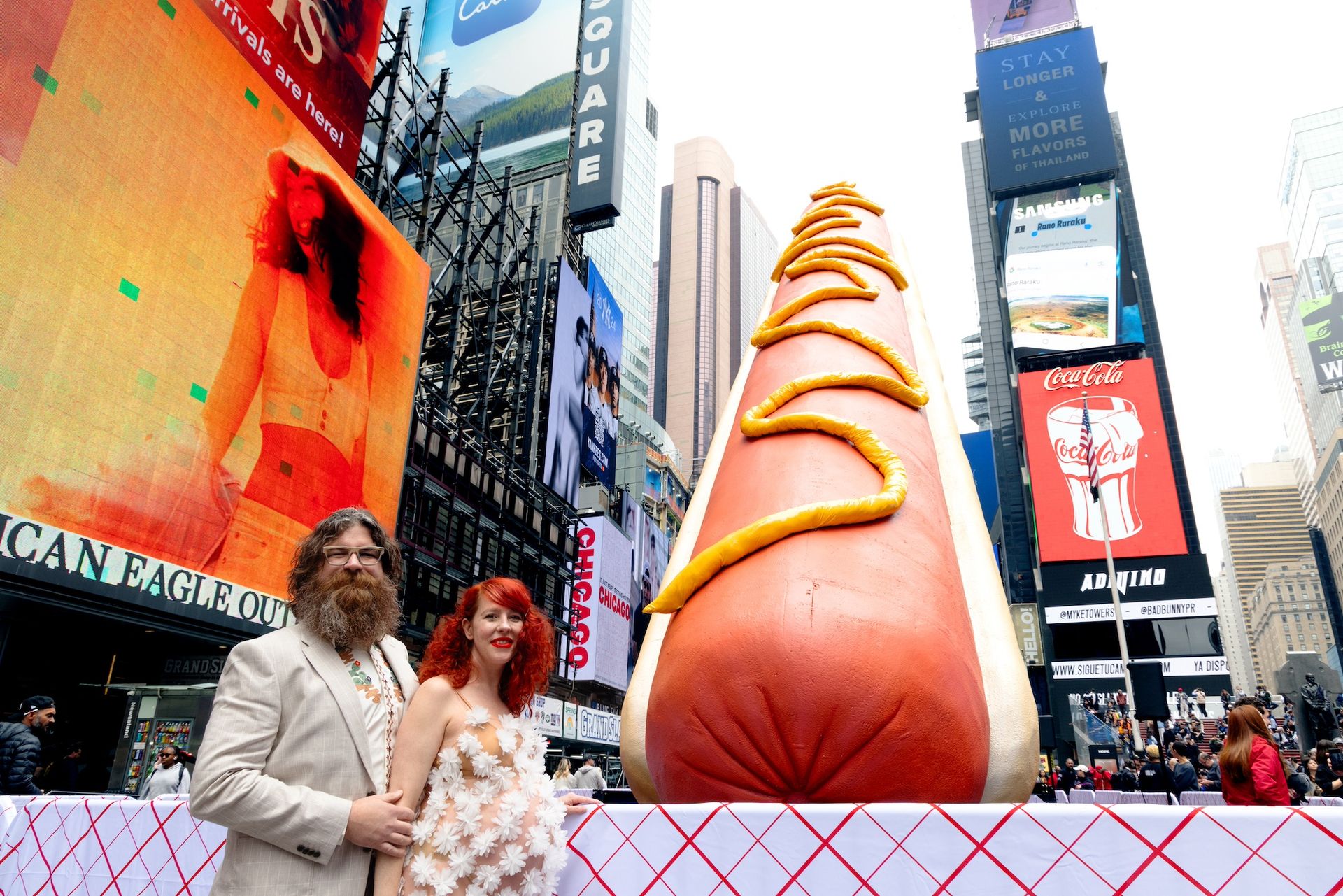 Times Square may seem like the worst place to savor the subtleties of contemporary art, but Brooklyn-based artists Jen Catron and Paul Outlaw believe their project for the chaotic Manhattan square is a sausage breaker. The pair erected a 65-foot-long hot dog at the so-called “Crossroads of the World,” which features a giant bun, a meaty frankfurter and a bright mustard. Every day at noon, a hydraulic lift lifts the giant junk food sculpture—Hot dogs in the city (2024) – Flying into the air, confetti shoots from the top.