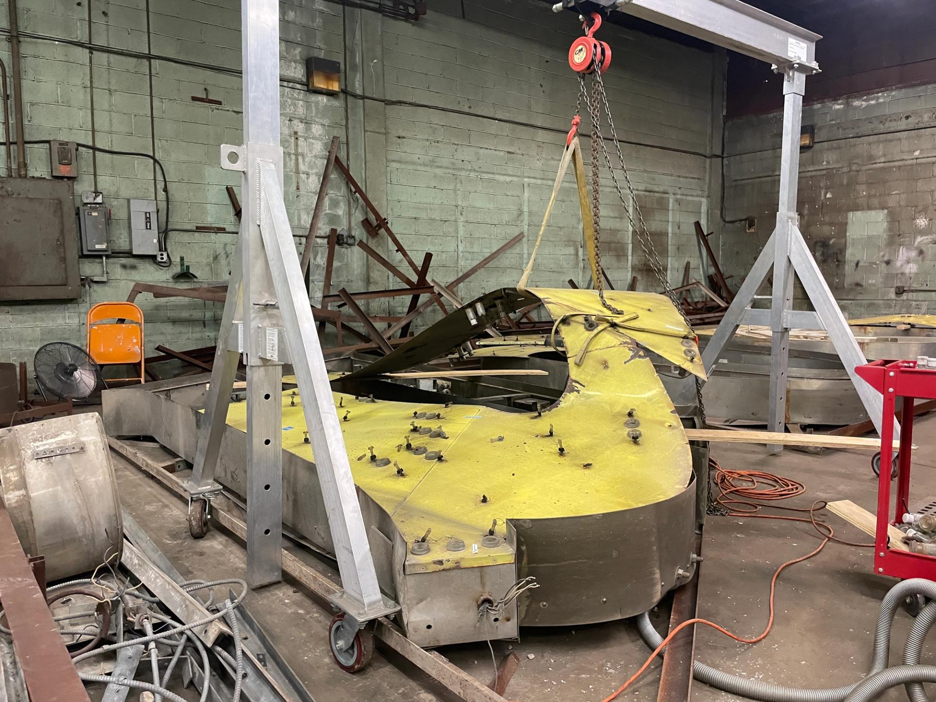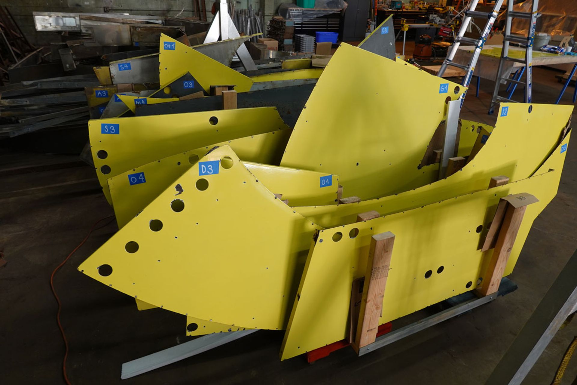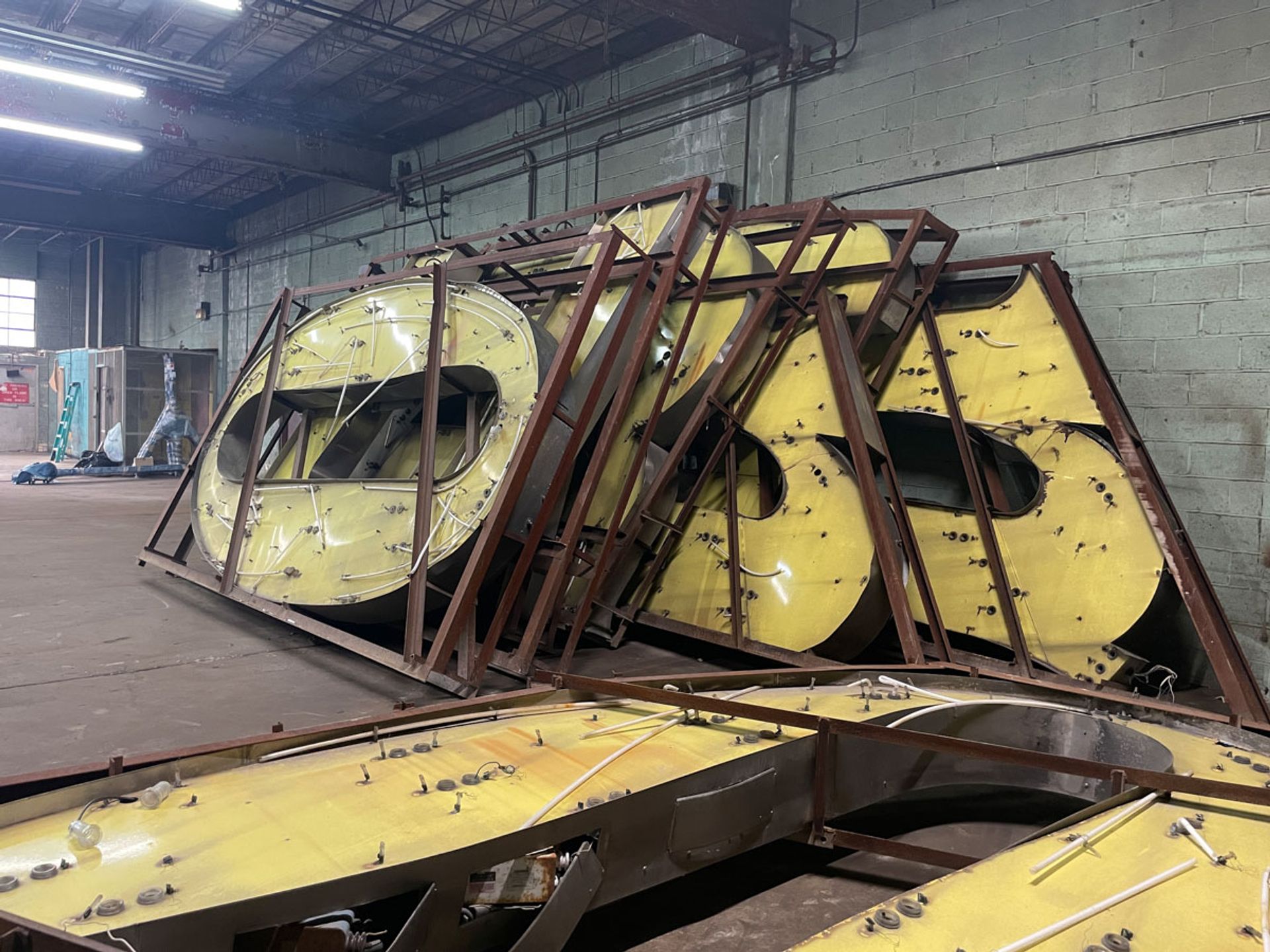 The part of the logo she ended up using in the installation was the haunting yellow letters. After carefully removing years of grime with Bar Keepers Friend liquid, she rearranged some (but not all) of the letter fragments into an 11-foot by 38-foot abstract wall sculpture—the final layout was just one of 75 different iterations she tried one of them.