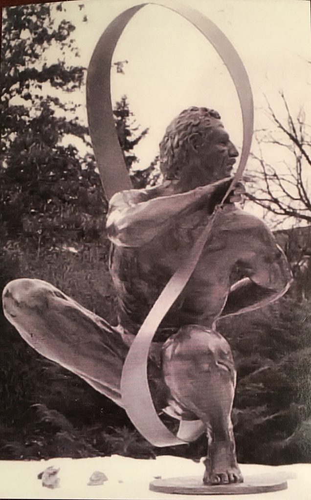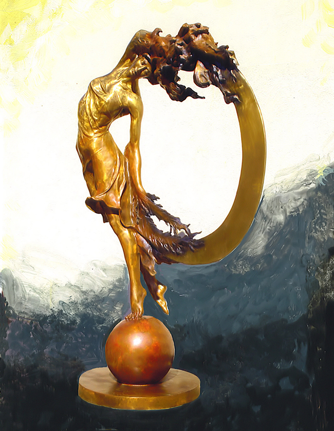 The composition is more vertical than the other works. The figure reaches upward, while the circular form extends around and behind it. This creates a sense of lift, as if the sculpture is moving beyond its base. The sphere beneath the feet adds to this feeling. It suggests a point of transition rather than a fixed foundation.