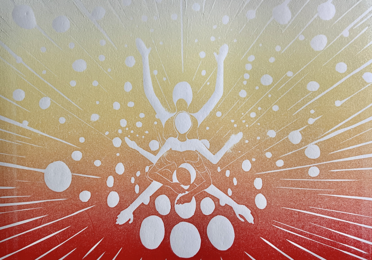 The linocut presents a stylized, multi-limbed human figure positioned against a radiant gradient background shifting from deep red at the base to golden yellow at the top. The figure appears layered or multiplied, with arms extending outward and upward in a gesture that evokes both surrender and ascent. Surrounding the body are circular forms—white orbs that suggest cells, stars, or seeds—scattered throughout the composition. Radiating lines burst outward, reinforcing a sense of expansion and energetic release.
