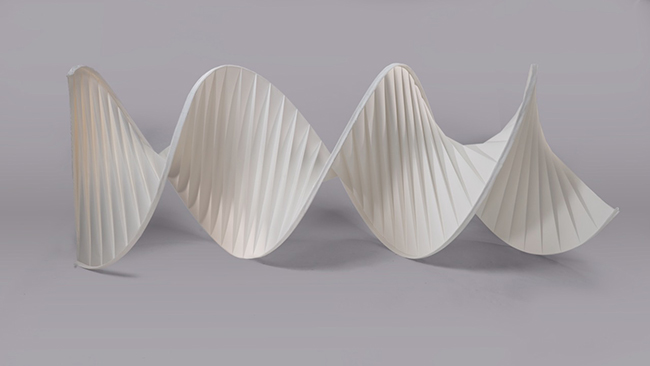 The artwork itself takes the form of a single, enormous sheet of Arches watercolor paper, forty-two inches by one hundred ninety-two inches. Folded by hand using traditional techniques, the paper becomes a living structure, an interpretation of DNA’s double helix. It’s less a painting than a sculptural meditation—one that blurs the line between precision and intuition. The folds cast shadows that move with light, creating a sense of quiet motion. Each crease carries the suggestion of replication, like life repeating itself in rhythm.