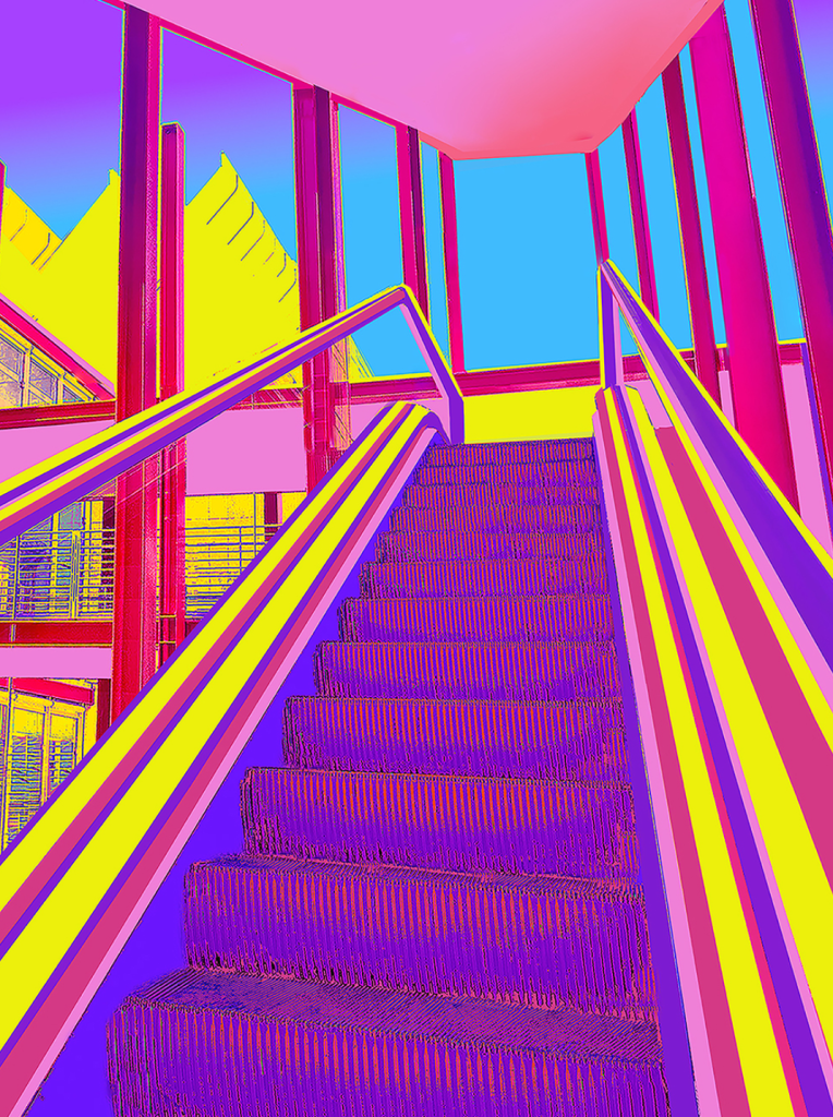 At first glance, the image feels playful and electric. The colors are bold, unapologetic, and immersive. Yet beneath that surface energy lies a careful balance of composition and direction. The rails guide the eye upward, the steps repeat in steady rhythm, and the ceiling frames a clear destination. Gottlieb uses these elements to suggest progress without strain. The climb feels inviting rather than arduous, reinforcing her view of the piece as an embodiment of positive and optimistic energy.