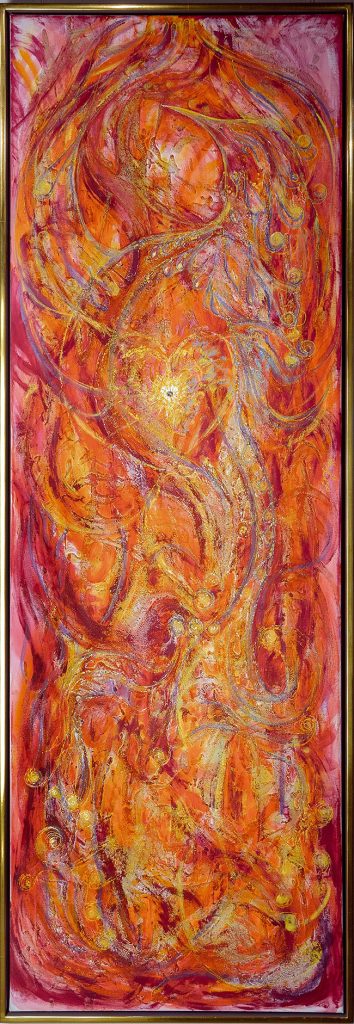In “Phoenix’s Dance,” destruction and renewal are not treated as opposites. They exist as part of the same movement, continuously feeding into one another. The painting does not resolve this cycle or offer closure. Instead, it holds it in motion, allowing the viewer to encounter a moment within an ongoing process. Through its material choices, vertical structure, and layered surface, the work becomes a space where change is not only represented but embedded into the fabric of the image itself.