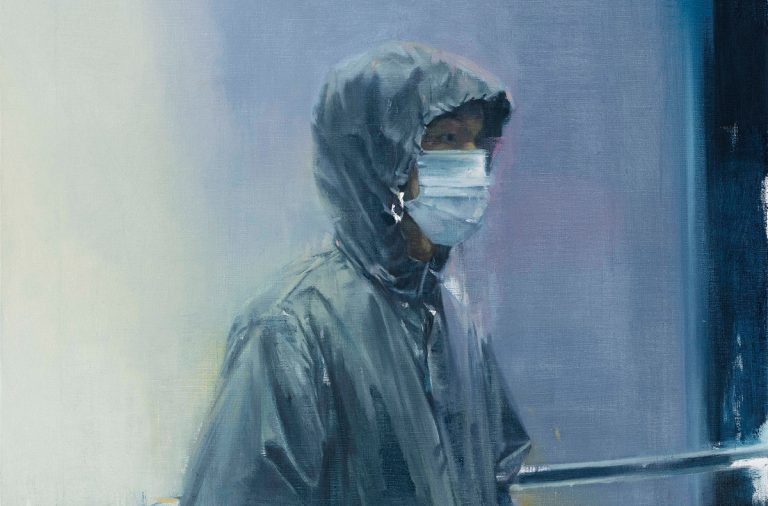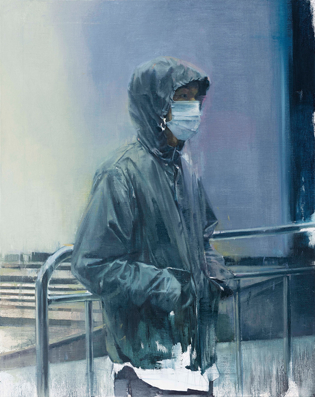 Waiting Person captures a mood that feels instantly relatable, even if the setting is vague and the figure is partially obscured. Kang presents a hooded person standing in what appears to be an urban space—rails, concrete, and muted tones suggest a public area, but nothing is defined enough to anchor it to a specific place. The figure wears a mask, hands tucked in pockets, body angled slightly away. The atmosphere is cool, washed in grays and pale blues. Everything feels quiet, suspended.