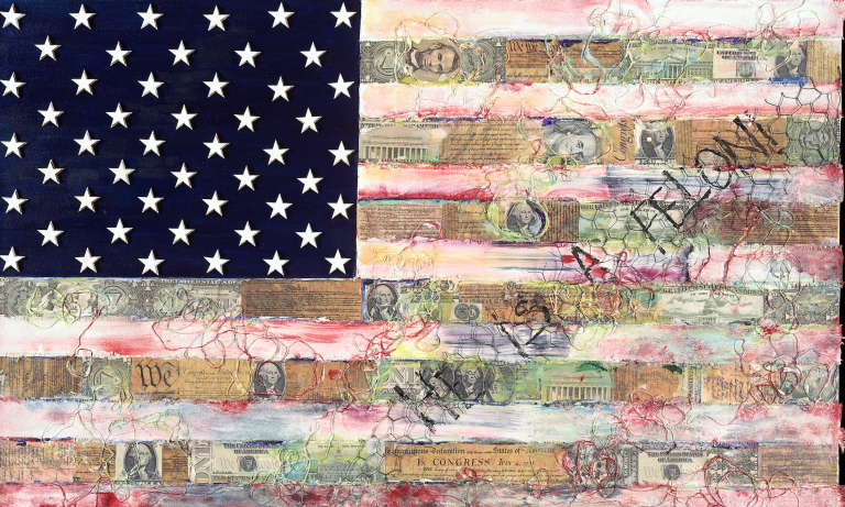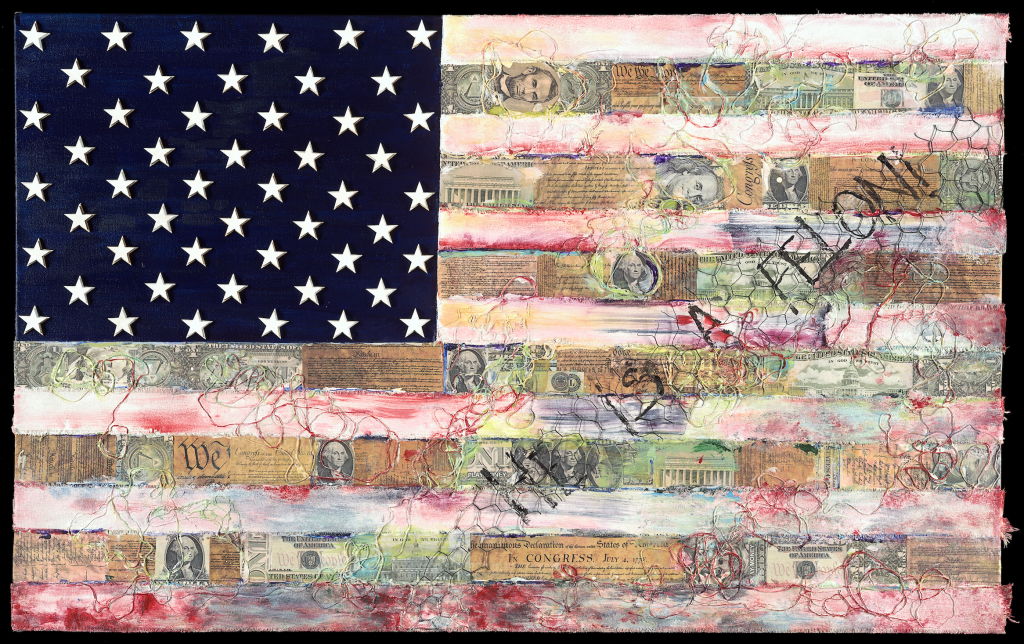 On the surface, the artwork reads like a constructed landscape. Built passages create highs and lows, like a map of pressure points. Light slips across raised areas and drops into recessed ones, and that shifting visibility mirrors the way public life works: some stories are highlighted; others are buried. The material layering feels like accumulation—experience stacked over time, arguments layered on top of history, ideals pressed against reality. There’s energy in the piece, but also restraint, as if the work is holding itself together while still showing the stress lines.