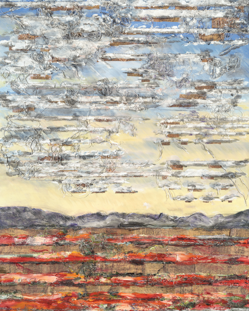 That approach becomes especially clear in We Are The People (2025), an acrylic and mixed media work measuring 60” x 48”. The scale matters. It places the piece in direct conversation with the viewer’s body. You don’t glance at it and move on; it holds you. The phrase “We Are The People” carries civic weight, but Morris doesn’t treat it like a slogan. She treats it like a question with no easy answer. Who is included in “we”? Who gets pushed out? What does “people” mean when systems divide people into categories?