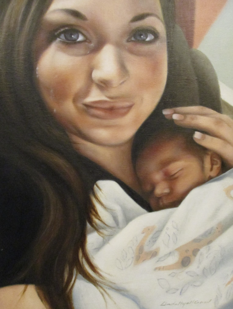 The story behind the painting is inseparable from the image itself. Maria went into labor on June 13th—her birthday—at the height of the COVID-19 pandemic. Hospital access was restricted. Only medical staff and one immediate family member were allowed inside. When complications arose, an emergency C-section became necessary. Theo arrived the following day, healthy, on Flag Day. Relief came not in celebration, but in survival: mother and child returning home safely, together, after an experience defined by separation and fear.