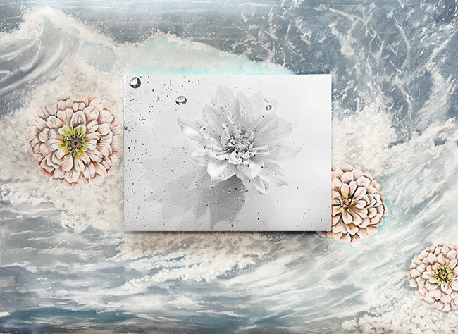 What makes these pieces distinct is the way floral forms emerge within that motion. The flowers do not sit on top of the water as decorative elements. Instead, they appear embedded within it, as if they have surfaced from the same energy that drives the waves. In The Floriferous Tides of Froth, the composition introduces a central image layered over the ocean backdrop. The grayscale flower at the center feels suspended, almost detached from the surrounding color, yet still connected through texture and form. Around it, softer-toned blooms echo the same structure, creating a dialogue between repetition and variation. The contrast between monochrome and muted color becomes a way of controlling focus, allowing one element to hold still while the rest continues to move.