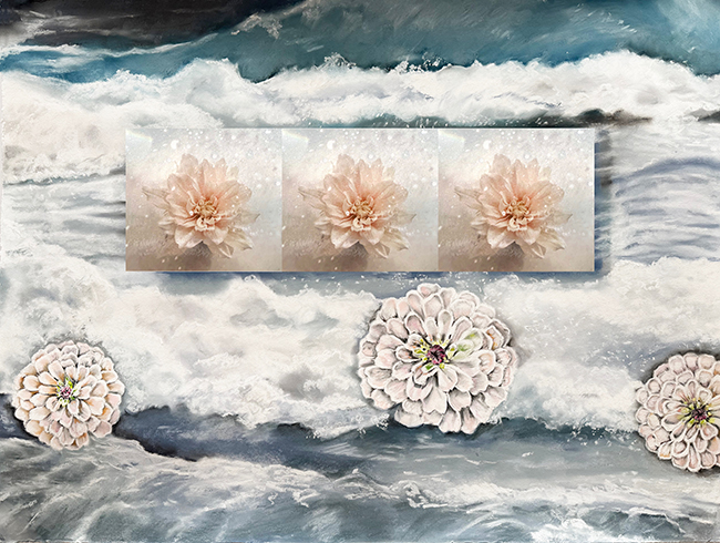 In The Blooming of Froth, this idea shifts. Rather than isolating a single central form, Laughlin expands the repetition. Three floral images stretch across the middle of the composition, creating a horizontal sequence that interrupts the vertical energy of the waves. This change in structure alters how the work is experienced. The eye moves laterally, following the rhythm of the repeated blooms, before returning to the turbulence of the ocean behind them. The flowers themselves feel softer here, their tones warmer, but they remain tied to the same underlying motion. They are not static objects. They seem to pulse with the same energy as the water.
