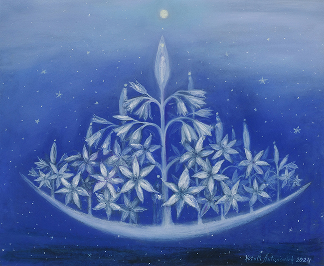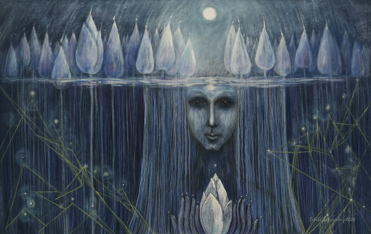 The art of Natali Antonovich feels like stepping into a dream that knows it’s awake. Her paintings open small doors to an inner landscape—one built on stillness, emotion, and quiet inquiry. She doesn’t aim to portray what’s visible but to trace what’s felt, sensed, and often left unspoken. For Antonovich, creation is not performance; it’s dialogue. Each piece begins with reflection, unfolding slowly, as if guided by breath. Her art grows out of silence, not noise, out of patience, not haste.