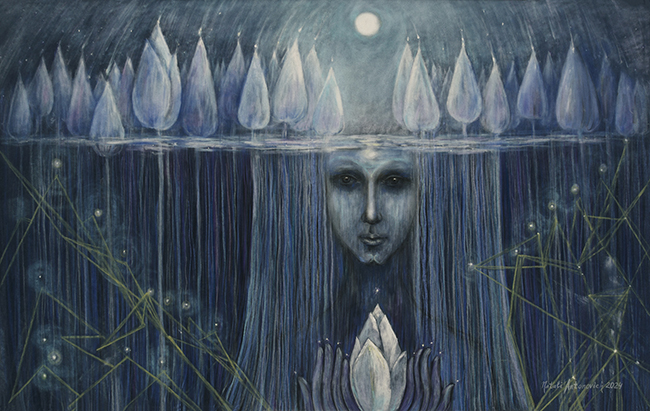 The central figure—half-human, half-spirit—appears to live within the element itself. The gaze is steady but distant, as if aware of something vast and unspoken. Above, a row of buds rests on the surface, awaiting bloom. Below, the figure cradles a single open flower—a gesture of offering, surrender, or prayer.