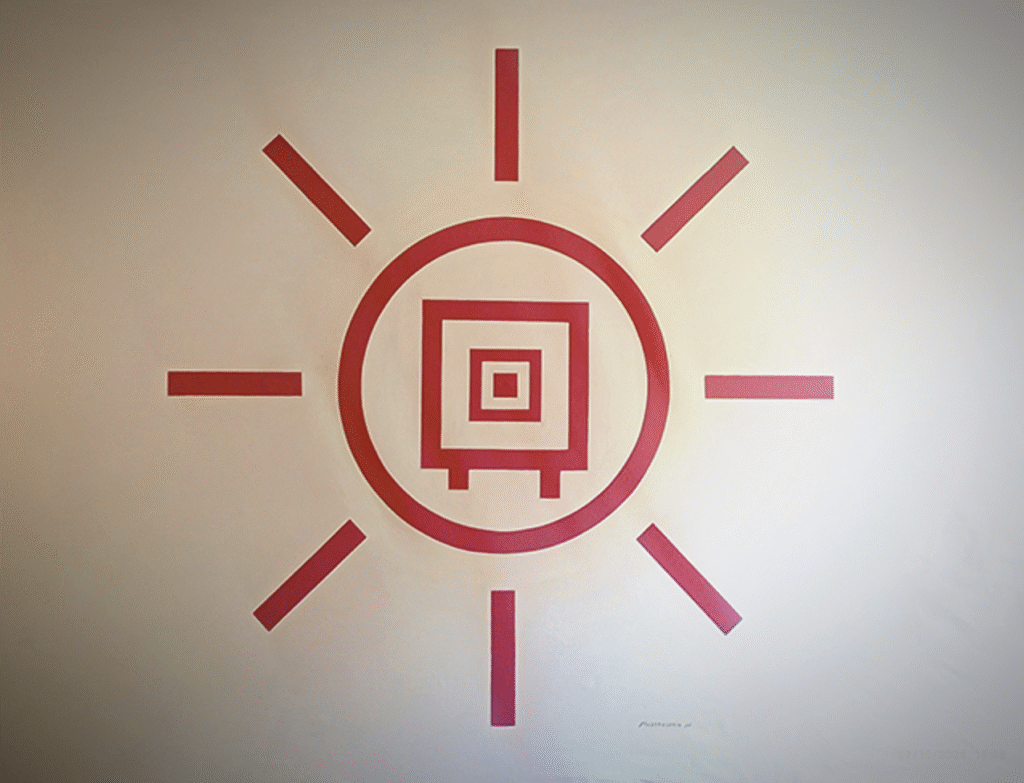 The design itself is spare: a circle, radiating beams, concentric squares at the center. Yet behind the geometry sits something larger. The outer light suggests expansion, while the nested forms pull the gaze inward, urging contemplation. It is a visual language that transcends words, an image that does not require translation.