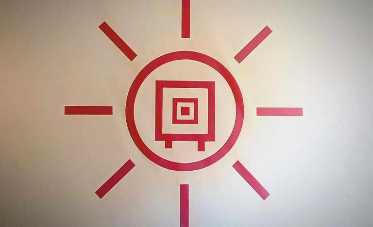 The design itself is spare: a circle, radiating beams, concentric squares at the center. Yet behind the geometry sits something larger. The outer light suggests expansion, while the nested forms pull the gaze inward, urging contemplation. It is a visual language that transcends words, an image that does not require translation.