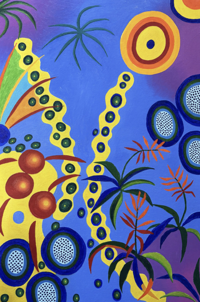 Midnight here isn’t absence—it’s intensity. Against darker grounds, color feels heavier, richer, more saturated. The glossy finish catches light in a way that can feel almost liquid, as if the painting carries its own climate. Her blend of organic shapes and geometric patterning becomes especially meaningful in this work. A garden is both wild and arranged, both free and managed. Midnight in the Garden holds that tension without resolving it, letting the viewer sit inside the contradiction.