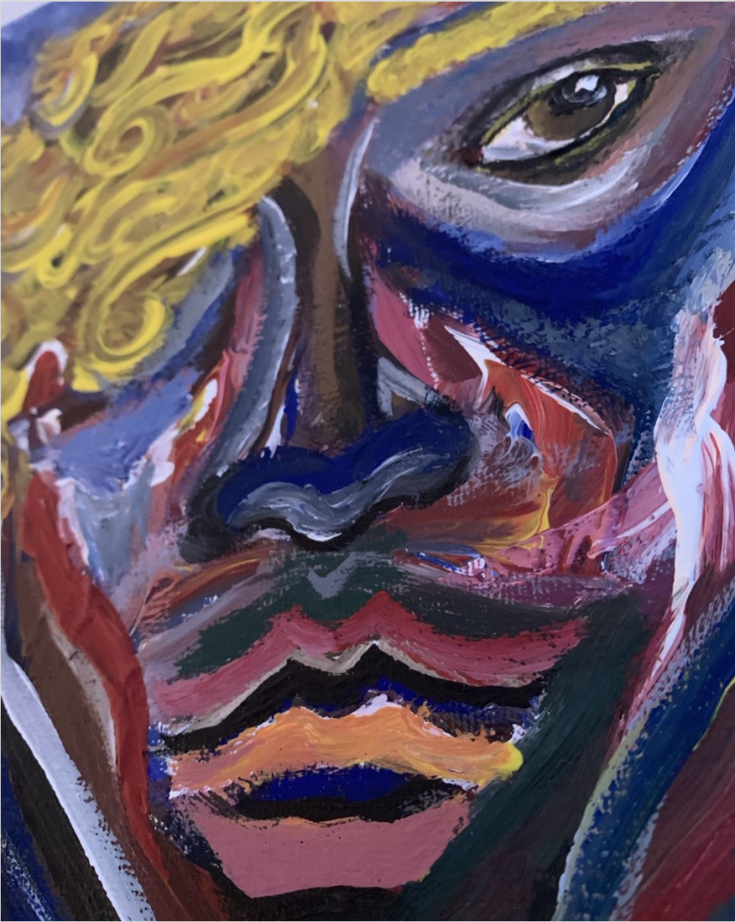 Her reference to Greek beauty is intentional. The strong facial structure—the defined jaw, sculpted nose, and luminous golden curls—echo the classical ideal. But Navajas doesn’t trap that beauty in history. She brings it into a contemporary conversation through riotous color and expressive brushwork. The face refuses to exist in one tone. Instead, it shifts between blue, crimson, violet, gold, and deep earth tones. This symbolizes something essential: beauty isn’t static. Identity isn’t singular. Strength isn’t one-dimensional.