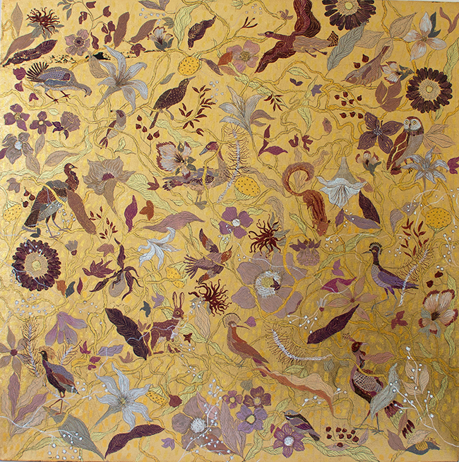 The palette is bold yet restrained. Plum and blush tones create depth and warmth, forming a quiet tension against the metallic sheen. The colors feel organic, almost botanical, yet they hover between abstraction and suggestion. Branches stretch and overlap. Leaves cluster and disperse. Within this network, birds and small animals begin to emerge—sometimes clearly, sometimes as fleeting impressions.