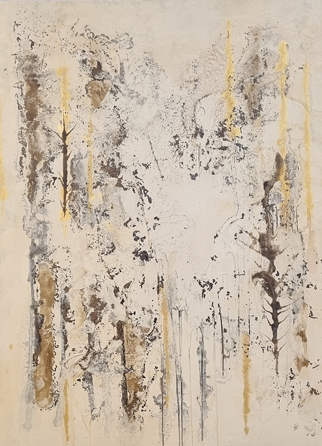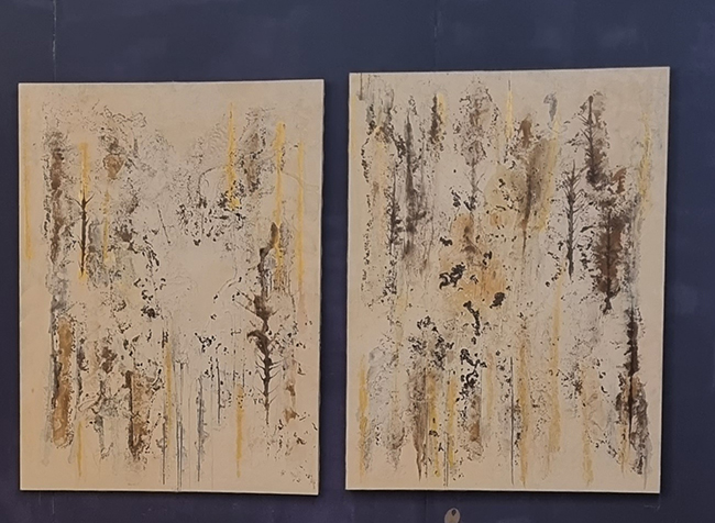Splatters, scratches, and dense passages of paint function almost like archaeological traces. They hint at remnants uncovered rather than images constructed. The diptych format reinforces this sense of dialogue: two panels speaking to one another across space, echoing cycles of decay and return. The work does not dictate a single reading but creates room for stillness, allowing viewers to bring their own reflections on impermanence and continuity.