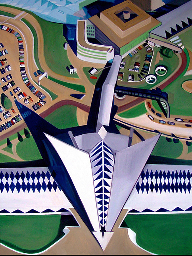 The work feels almost like a map, yet it is never cold or mechanical. From above, the airport resembles a dramatic sculpture shaped by sweeping curves, stretching outward like wings in motion. The comparison to a bird in flight feels natural. Airports are places of departure, arrival, and transition. They are symbols of forward movement. They also represent modern architecture’s urge to look sleek, smooth, and weightless. Toni captures that spirit without painting literal detail. The structure becomes form—clean, open, dynamic.