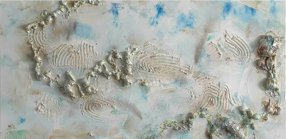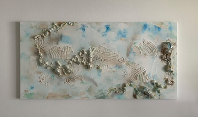 Her painting “Prints of the Path” is a clear example of this approach. At first glance, the work feels like a gentle atmospheric landscape, washed with pale whites, creams, and faint touches of blue and green. But as your eye settles, it becomes clear that it is more than softness and color. The painting is layered, textured, and alive with subtle movement. Maria describes the work as an exploration of personal journeys and the traces people leave behind as they walk through life. It reflects the idea that every experience leaves an imprint—not always visible, but always present.