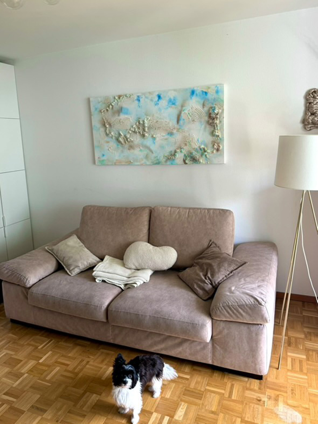 Inspired by Montreux, a place known for light reflections, shifting skies, and a meeting of natural beauty and lived human life, the painting holds a quiet sense of place without being literal. Instead of painting Montreux directly, she captures the atmosphere of it: calm, layered, reflective, and deeply emotional. There is also a deeper tension in the work. Maria mentions “two sides of reality and truth,” and you can sense that in the painting. Some areas feel smooth and almost peaceful, while others are rough, raised, and marked by stronger textural gestures. It reflects the idea that truth is rarely singular. Life does not move in one straight emotional line. Instead, we cross between clarity and uncertainty, comfort and challenge, softness and resistance.