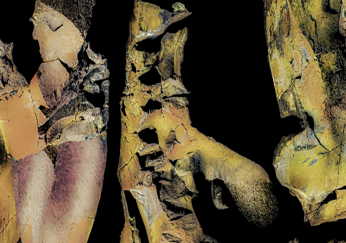 Jollon’s photographic work Mythical Geology considers how landscapes can carry narrative. On first encounter, the piece appears as an abstract study of rock and mineral formations. Earth-driven hues—rust, ochre, deep browns—recall clay, soil, and eroded cliffs. The textures feel tactile, pulling the viewer into fissures and surfaces that seem almost touchable.